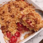 Bake for 45-50 minutes. We are looking for visual cues: the fruit filling should be bubbling aggressively around the edges (indicating the center has reached temperature), and the topping should be a deep golden brown. If you spot dry white patches halfway through, a small drizzle of extra melted butter will correct the hydration issue.