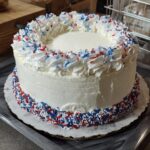 Spread the frosting evenly over the cooled cake. Reserve a small amount for the stars. Outline a rectangle in the upper left corner for the “stars” field and fill with blueberries. To create white stars, dip remaining blueberries in reserved frosting and roll in sugar, then place them amongst the blue field.