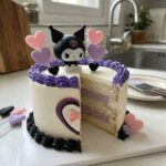 Serve this cake immediately after decorating to enjoy the freshest texture possible. A side of tart raspberry coulis or fresh blackberries complements the sweetness and fits the dark-and-pink Kuromi aesthetic. If you are hosting a themed party, consider adding a car cake to your dessert spread for a fun variety of designs. This sponge is light enough that it doesn’t need heavy sides—just a simple glass of cold milk or a light tea will do perfectly. For a real treat, serve each slice with a small scoop of vanilla bean ice cream.